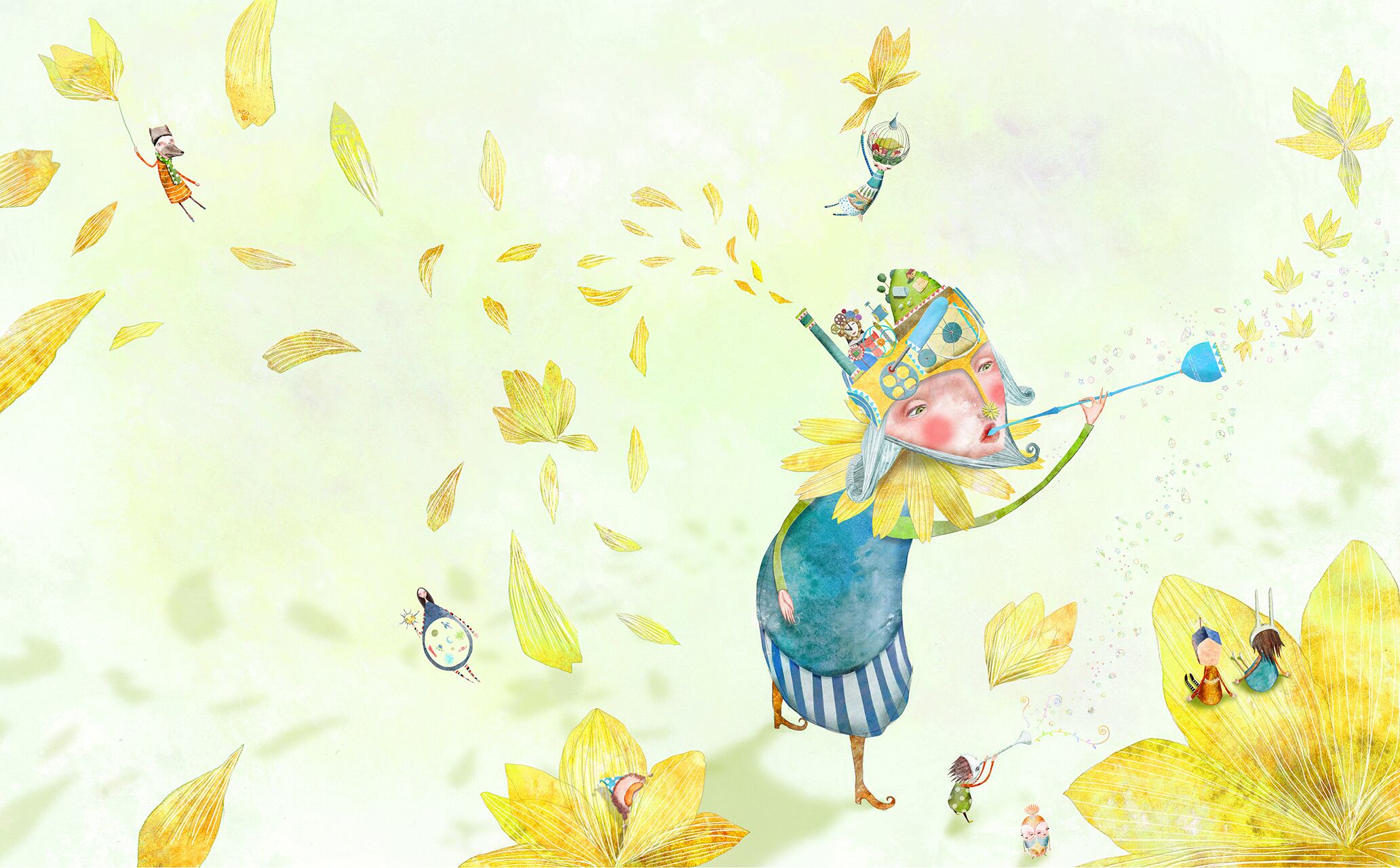 お茶のひとときを楽しむティーカップさん、お花をまきちらす王さま、つぎつぎ出てくるマトリョーシカ、ぽかぽか日よりに毛皮をせんたくする女の子、ラッパをふきならす白いお面……。ふしぎな仲間たちがおくる、かけがえのない一日一日。それぞれの世界をよくよく見ると、ゆっくりつながっていきます。繊細なイラストレーションでつづられたユーモラスな日々は、ページを見返してみるたびに新しい発見を生みだします。